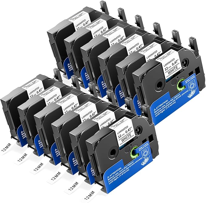 - [ Easy to Use ]The backing of label maker tape is split in the middle for easy peeling. These replace for Brother label maker tape 12mm 0.47 inch laminated white tape print clear text for quick identification. White on black labels do not leave a sticky mess when they are removed
