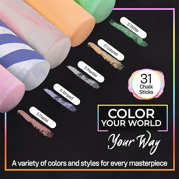 - Creative Outdoor Fun: Ignite endless fun with 31 bright chalk sticks in glitter, marble, striped, and pastel styles. Ideal for kids' outdoor play, draw hopscotch or colorful masterpieces on sidewalks, driveways, and patios