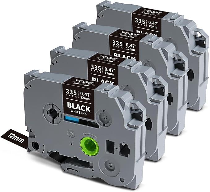 - Package Included: 4 Pack replacements compatible for Brother Ptouch label maker tapes TZe-335. Dimensions: Each pack measures 1/2" (0.47") in width and 26.2 ft (8m) in length, totaling 48 meters across all packs. The 12mm tape is a standard size frequently used in everyday applications.