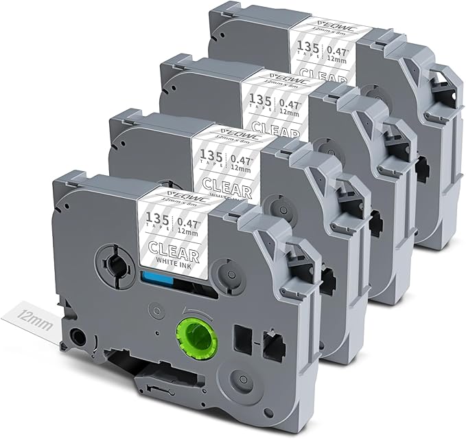 - Package Included: 4 Pack replacements compatible for Brother Ptouch label maker tapes TZe-135. Dimensions: Each pack measures 1/2" (0.47") in width and 26.2 ft (8m) in length, totaling 48 meters across all packs. The 12mm tape is a standard size frequently used in everyday applications.