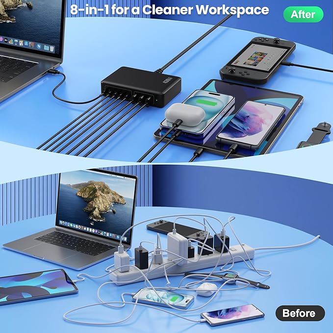 - 【430W Super Fast 8-in-1 Usb C Charger Block】Our USB charger provides multi charging options to meet your different needs. With 5*USB C ports and 3*USB A ports, no need for more adapters, you can use just one outlet to plug in laptops, tablets, smartphones, Bluetooth speakers and other small gadgets like earbuds, smartwatches, game consoles etc.Our USB C charging stations feature 8 independent output ports, ensuring all devices can charge simultaneously at full speed without power sharing and disconnection,this 8-in-1 charging station will reduce your accessories burden and help you create an organized and clean desktop.