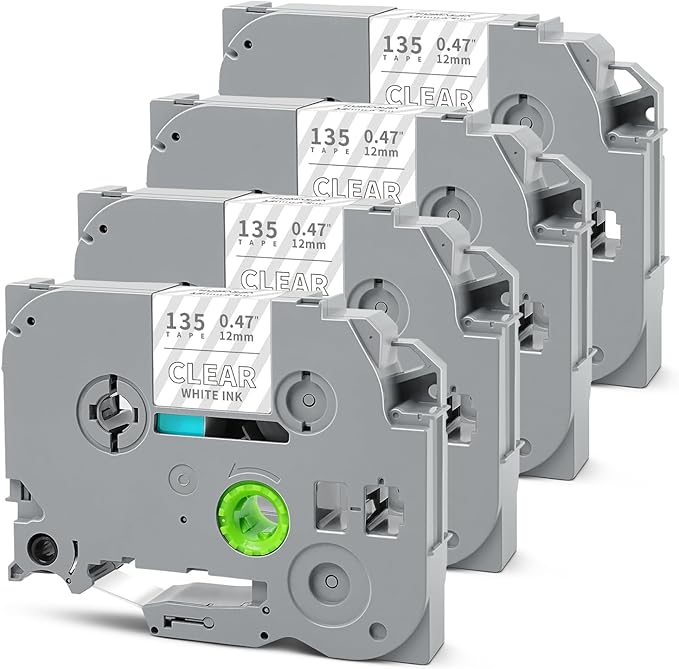 - Packages: 4-Pack 12mm 0.47" clear label tape compatible with Brother tze-135 12mm 0.47 white on clear tape. Color: White on Clear. Size: 1/2 inch (12mm 0.47") x 26.2 feet (8m)