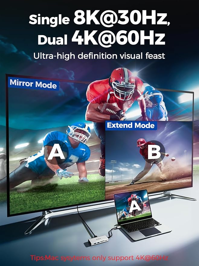 - 【Dual Display Ultra HD Output】The docking station dual hdmi supports single 8K, dual 4K@60Hz mirror/extend modes. Ideal USB C to HDMI adapter for MacBook/Windows laptops. Ultra clear images bring you a visual feast!(Note:1、HDMI1 8K requires DP1.4 protocol PC support (Mac systems only support 4K ). 2、For MAC, the display on both external monitors will be identical.)