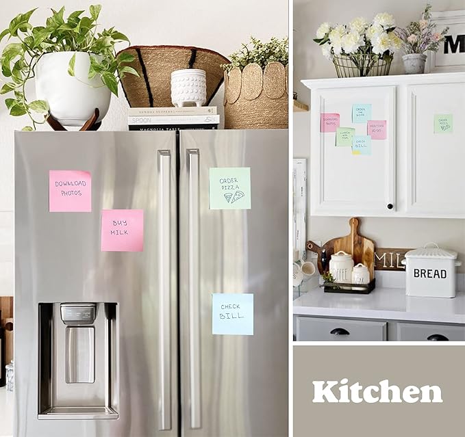 - High Quality Paper: Sticky notes pads made with 75 GSM thicker paper, flat sticky notes are strong, stay on any surface without curling.Gel pens, highlighters & Sharpies glide smoothly without bleed-through. Reinforced edges prevent curling even in humid kitchens or sunny car dashboards.