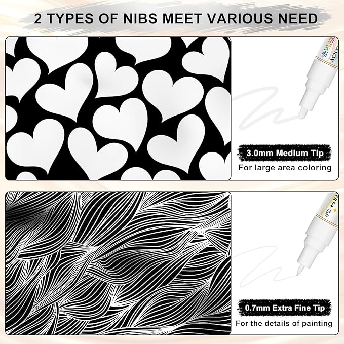 - Dual-Tip Design for Versatility: Each paint pen features a 0.7mm fine tip for detailed lines and a 3mm medium tip for filling larger areas, making it perfect for outlining, lettering, and adding intricate details to your DIY projects