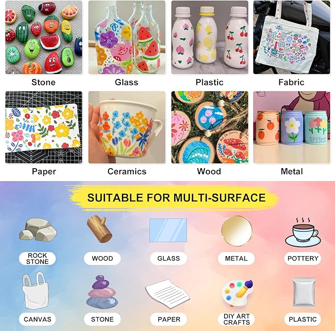 - Multi-Surface Use: This acrylic paint pen has a strong covering power, perfect for a variety of surfaces including stone, ceramic, glass, wood, fabric, metal, plastic, and more. Great for crafting, labeling, and adding creative touches to sneakers, pottery, and terracotta