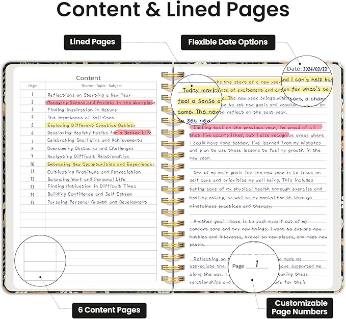 - Structured College-Ruled Pages: Featuring 7mm college-ruled lines, this journal notebook helps keep your writing organized and legible. The evenly spaced lines are perfect for structured notes, work lists, or detailed writing, making it an excellent choice for school students, professionals, and writers alike. It also includes 6 content pages, perfect for creating an index for easy reference.