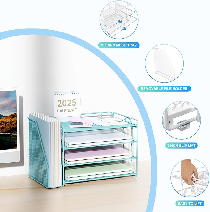 - ▶ Save desktop space: The office desk organizer provides you with 4 paper trays and a vertical file organizer, providing ample space for your desktop and helping to keep your desktop organized and free of clutter.
