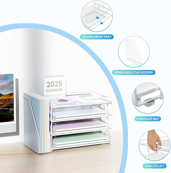 - ▶ Save desktop space: The office desk organizer provides you with 4 paper trays and a vertical file organizer, providing ample space for your desktop and helping to keep your desktop organized and free of clutter.