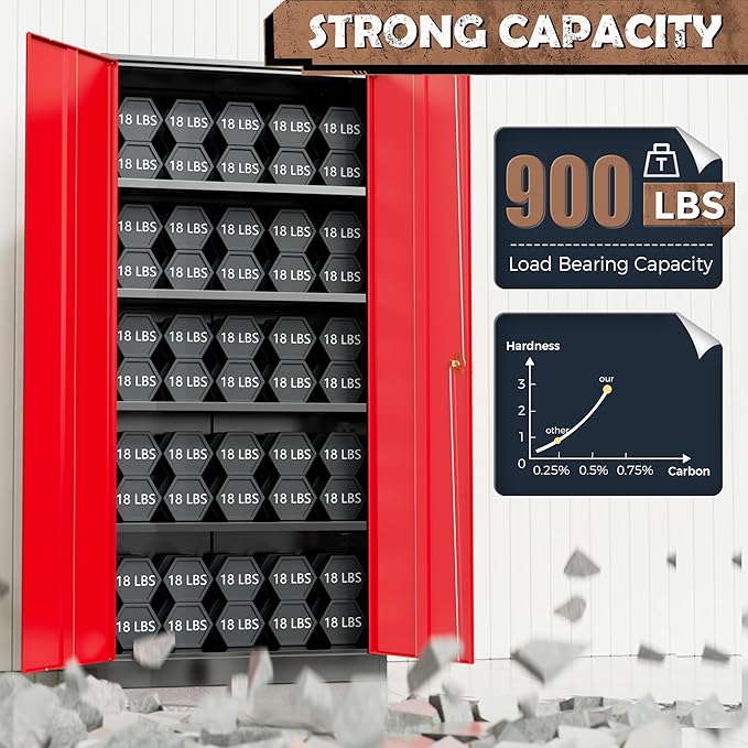 - ✅【4 Adjustable Shelves】Metal cabinet is made of high quality cold rolled steel, prevent from scratching, denting, chipping; adopting powder coat, anti-rust and colorfast. There are 4 adjustable shelves and 5 tier storage space meet your needs to store different size items, each shelf of locking storage cabinets can load 180lbs