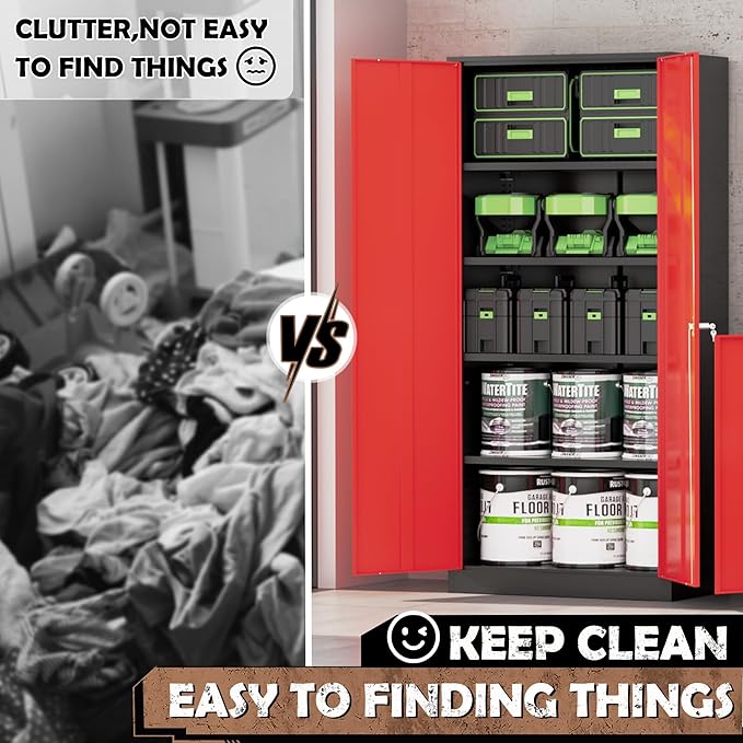 - ✅【Safe Locking System】Designed with 1 Lock and 2 keys, secure all of your items, better privacy, high safety. 2 keys for standby, if it is missing and just contact us to get replacement keys. More importantly,this garage storage cabinet is designed with protruding door handle, more convenient to grasp and easy to opening the metal office cabinet