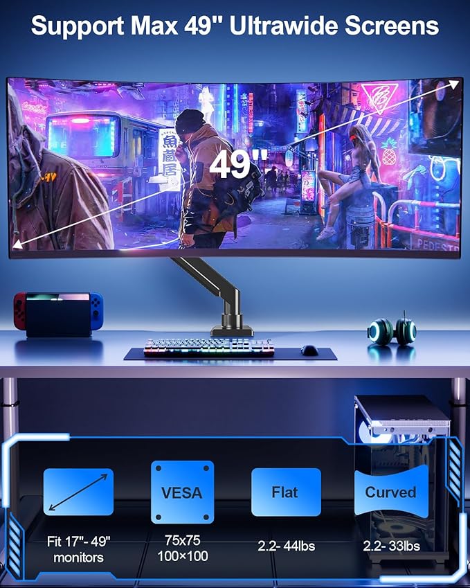 MOUNT PRO Heavy Duty Monitor Arm for Max 49 Inch Ultrawide Screens up to 44 lbs, Aluminum Premium Single Monitor Mount for Samsung Odyssey G9 and More, Adjustable Display Desk Stand, VESA 100x100mm