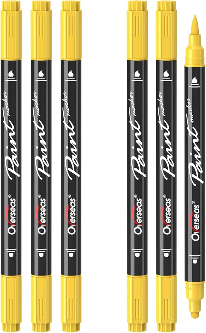 Overseas Yellow Acrylic Paint Markers, 6 Pack Dual Tip Paint Pens Acrylic Markers - Dot and Brush Tip Coloring Marker for Wood, Rock, Canvas, Glass, Metal, Plastic, Rubber, Fabric, School Supplies