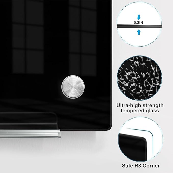 - COMPREHENSIVE ACCESSORIES SET: Comes with one 60" x 36" frameless tempered glass whiteboard, two markers, four magnets, one eraser and one marker tray for mounting. Pay special attention to the magnetism will not be strong due to the thickness of the glass, standard magnets do not work. Please use silvery super strong rare earth magnets. Don't use normal black magnet and fridge magnet.
