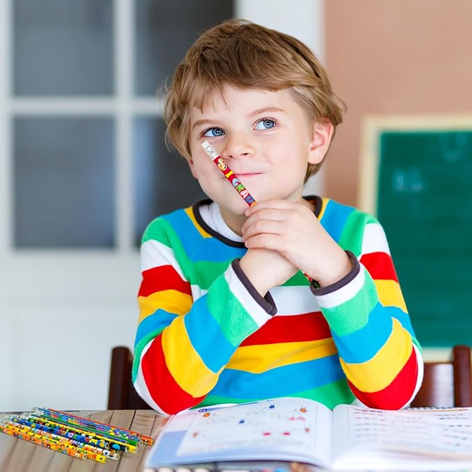 - Cute & Fun Designs:Each pencil is decorated with bright, cheerful patterns, including graduation caps, stars, and fun messages that inspire young learners. Kids will love using these pencils for drawing, writing, and school activities