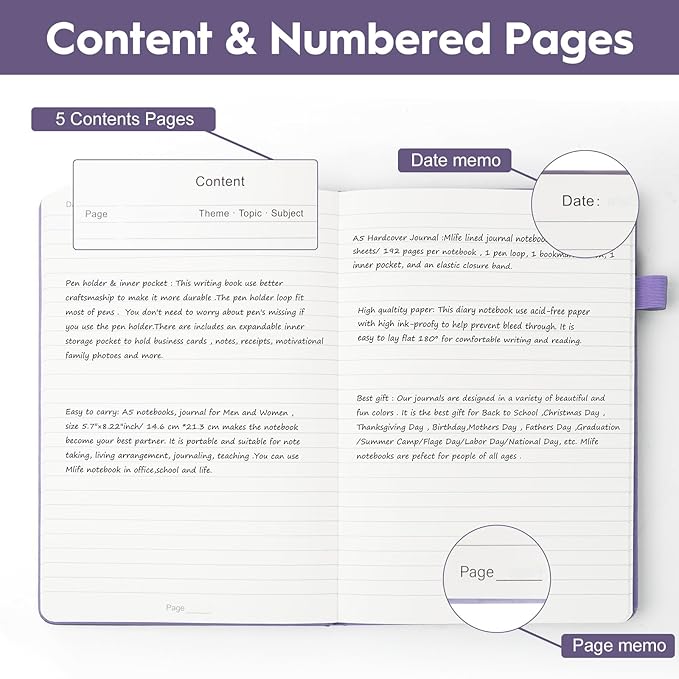 • 【Humanized Design】5 Contents Pages for detailed indexing. No more worrying about not having enough index pages; 1 Exquisite ribbon bookmarks to mark your place effortlessly; 1 Elastic closure band to keep your pages safe; 1 pen holder for convenient storage.; 1 Back Inner pocket for storing notes, receipts, or small items.