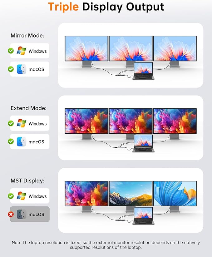 - 𝐓𝐫𝐢𝐩𝐥𝐞 𝐃𝐢𝐬𝐩𝐥𝐚𝐲 𝐃𝐨𝐜𝐤𝐢𝐧𝐠 𝐒𝐭𝐚𝐭𝐢𝐨𝐧 - ONLY Windows supports Extend Mode with up to three displays, while macOS only Mirror Mode. This docking station features dual HDMI and one VGA port. With two monitors, it outputs 4K@30Hz + 1080P; with three monitors, all displays will output at 1080P@60Hz. HDMI 1 supports up to 4K@60Hz when used alone. All of the above modes require a DP1.4 laptop and monitor.