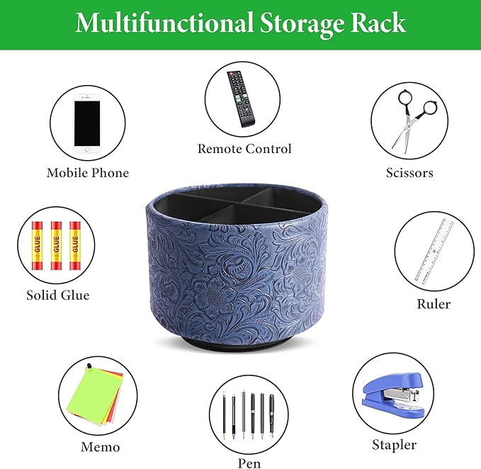 lizimandu Round Leather Art Supply Organizer,Remote Control Holder,360 Degree Spinning,Multi-Functional Pencil Holder,4 Compartments Desktop Stationary Organizer(1-Carved Dark Blue)