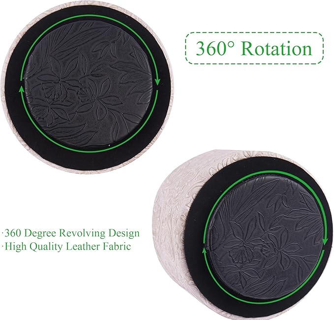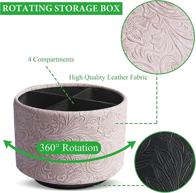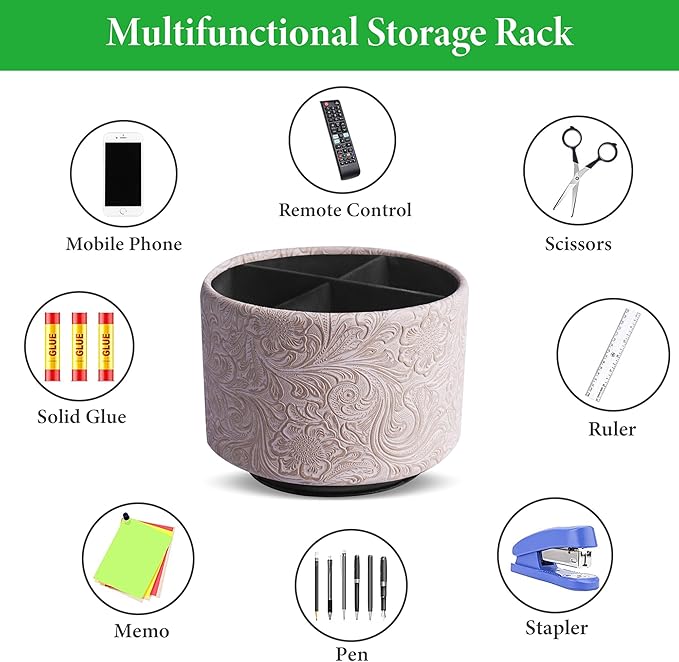 lizimandu Round Leather Art Supply Organizer,Remote Control Holder,360 Degree Spinning,Multi-Functional Pencil Holder,4 Compartments Desktop Stationary Organizer(1-Carved White)