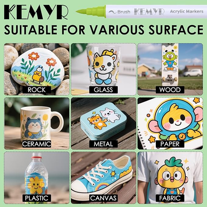 - Dual Tip Acrylic Paint Pens----Each KEMYR pen is equipped with a 1 mm fine tip for lines and details work, and a 1 - 5 mm brush tip for filling large areas and coloring. By changing the brush pressure, you can create different strokes, saving the trouble of changing tips.