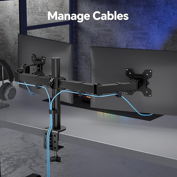 - Compatibility: Dual monitor mount fitting two screens 13” to 27” in size and up to 18 lbs in weight each with VESA 75x75mm or 100x100mm backside mounting holes. Cable management clips are provided along the arms and center pole.