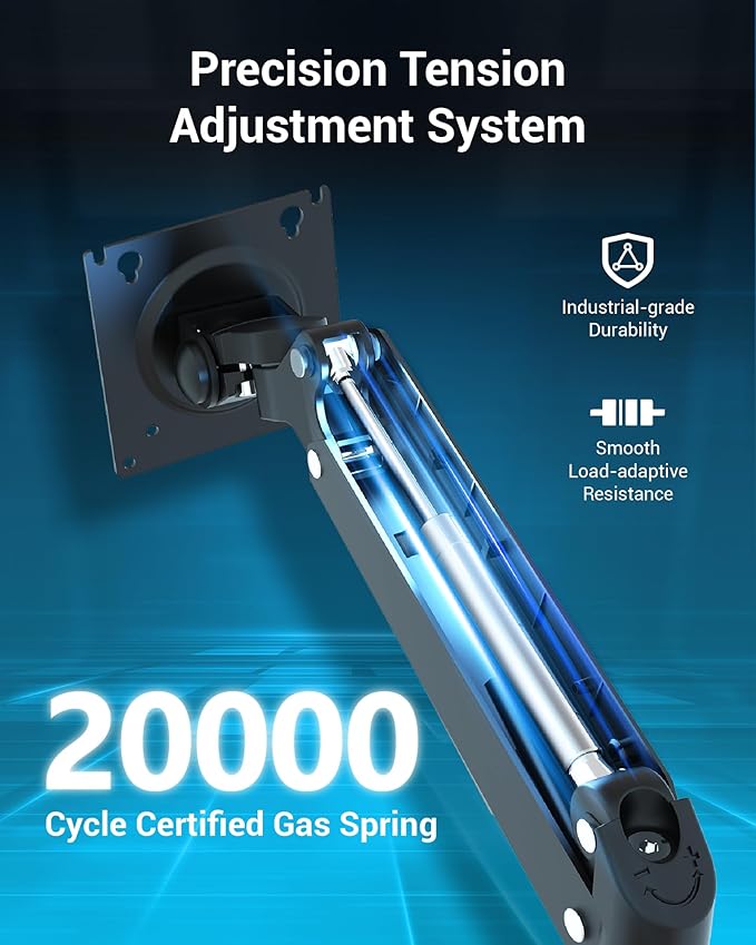 - 【Industrial-Grade Durability】 Equipped with premium gas springs to eliminate rebound, our monitor desk mount delivers ultra-smooth, effortless screen adjustments—far surpassing standard stands. Rigorously tested over 20,000+ cycles, it guarantees rock-solid stability at every extension angle.
