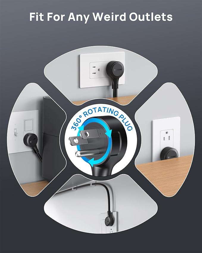 - 360° Rotating Flat Plug: 360° rotating flat plug design can fit any plug and be inserted perfectly at any angle(0.73 in thickness). Handy to use in confined areas. US Utility Patent No. 11901685. Made of 14AWG pure copper, the 5-foot extension cord is heavy-duty and has better current carrying capacity (15a).