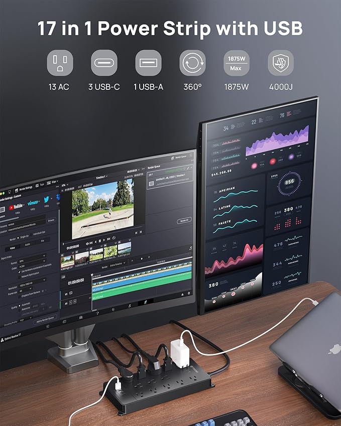 - 17-in-1 Power Strip with USB C Ports: This versatile extension cord with multiple features 13 widely spaced AC outlets and 1 USB-A & 3 USB-C ports, It supports 1875W/15A and universal voltages (100V-250V), Its spacious layout can accommodate large adapters side by side, making it perfect for larger setups such as gaming stations, media centers, or home offices.