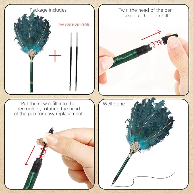 - 【Multi-Functional Art Piece】 From calligraphy gifts to Harry Potter party supplies, CROWN GUIDE's decorative quill pen with 2 pieces extra black refills as desk decor with feather top for vintage displays. Waterproof ink for all occasions.