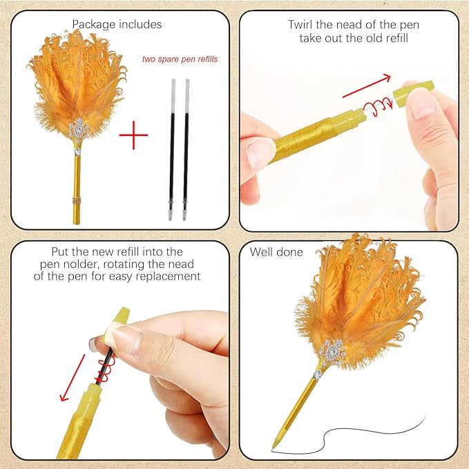 - 【Multi-Functional Art Piece】 From calligraphy gifts to Harry Potter party supplies, CROWN GUIDE's decorative quill pen with 2 pieces extra black refills as desk decor with feather top for vintage displays. Waterproof ink for all occasions.