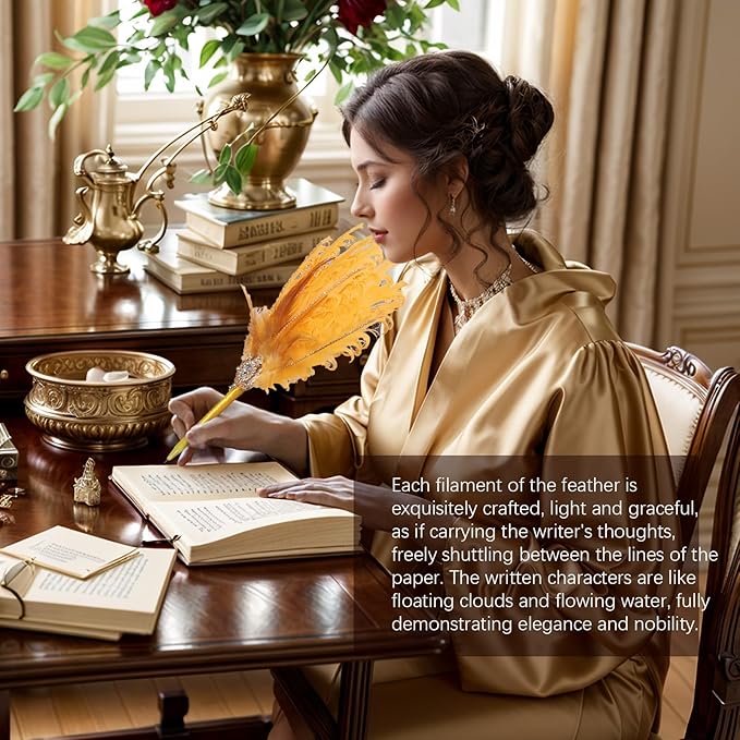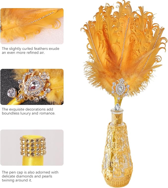 - 【Dual-Feather Luxury Design】 CROWN GUIDE's feather pen features a cloud-like cluster of hand-curled goose feathers accented with gold chains, paired with a satin-wrapped barrel for sophisticated wedding guest book signing and vintage desk styling.