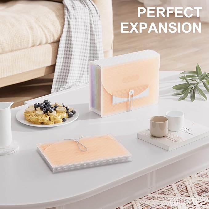 - HOMEOFFICE FILE ORGANIZER:ThinkTex Portable accordion file organizer, with both the top and bottom expandable. It has 12 dividers and 13 pockets, as well as removable colorful monthly labels. Suitable for letter/A4 size documents, it can keep your tax files, monthly bills and receipts neatly organized.