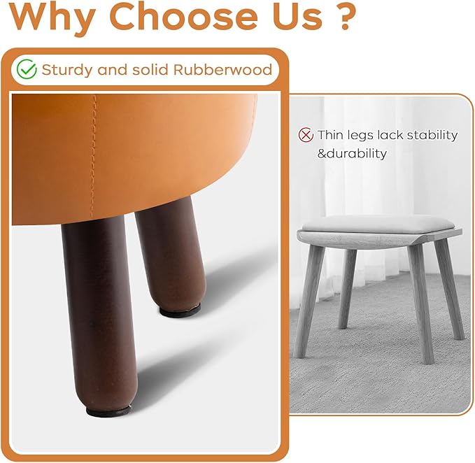 - 【Anti-Slip Design】- These leather foot stools small ottoman rubber legs come with dedicated felt pads to prevent scratches on floor and keep it from sliding.Wood leg with non-slip felt pad is quiet when moving, and can avoid leaving scratches on floor.The small footstool is perfect for small spaces and is compact enough not to get in anyone's way.