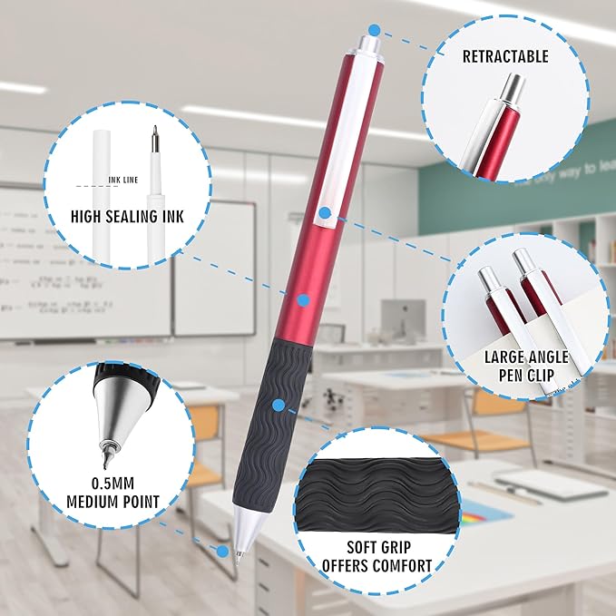 - 4.Black ink, retractable construction: fade-resistant water-based ink meets ISO durability standards. Stainless steel nib and shatter-resistant ABS barrel withstands drops without damage. Retractable gel pen with clip is easy to carry and hard to lose.