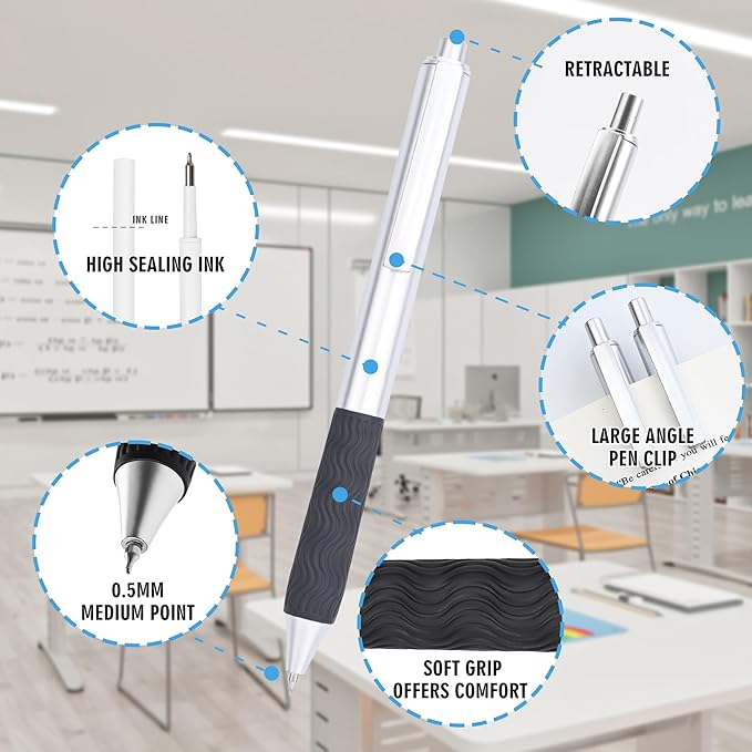 Bulk Black Pens, 50 Black ink Gel Pens,0.5 mm Fine Tip,Wholesale Fine Teacher Pens,Back to School Supplies,Gifts for Friends (Silver Body)