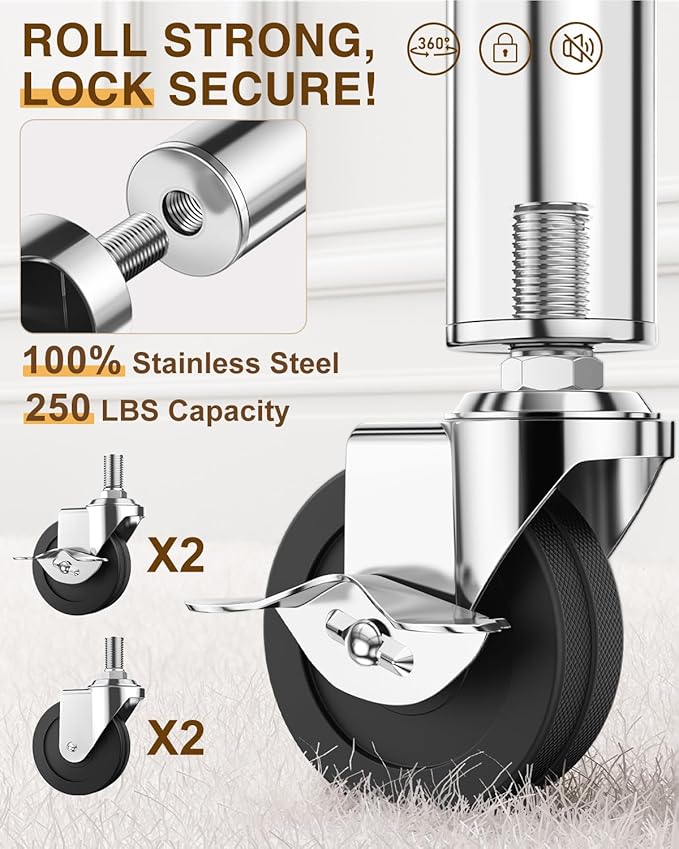 - UPGRADED STAINLESS STEEL—NO MORE WHEEL BREAKING! We've replaced weak plastic parts with durable stainless steel fittings and upgraded to larger, heavy-duty wheels that won't bend or crack under heavy loads. The smooth 360° swivel design makes repositioning effortless, even when the clothing rack with shelves is fully loaded. Two wheels are lockable for added stability, and the upgraded design is both quiet and safe for all floor types. Fybee clothes rack, built to last, built for convenience.