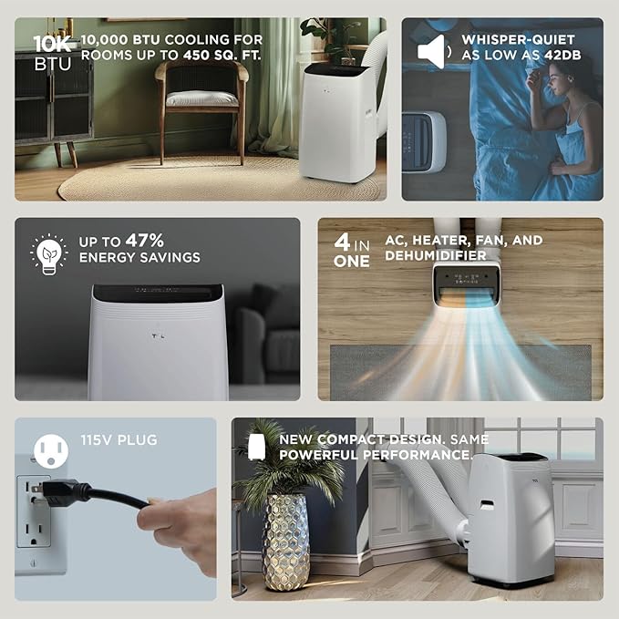 - 4-In-1 Comfort: Chill out, warm up, cool down, or dry off with TCL’s 4-in-1 portable AC, Supplemental Heater, Fan, and Dehumidifier to suit a wide array of needs