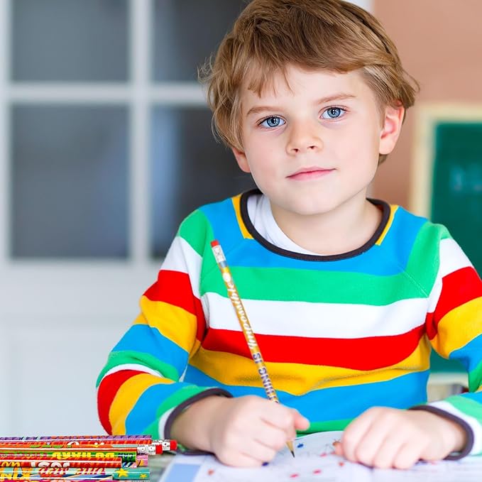 - Cute & Fun Designs:Each pencil is decorated with bright, cheerful patterns, including Inspirational saying, stars, and fun messages that inspire young learners. Kids will love using these pencils for drawing, writing, and school activities