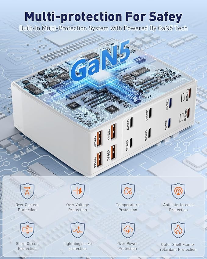 - 【Universal Compatibility】Our USB C charging station is equipped with 2*100W and 2*65W fast charging ports, which can charge 3 or more laptops at the same time. Compatible with smartphones, tablets and laptops, suitable for MacBook Pro/Air, Dell XPS, iPad Pro, iPhone 16/16 Pro Max, iPhone 15 Pro Max, iPhone 14/13 Pro/12 Pro Max, iWatch, AirPods, Surface Pro, Galaxy S24 Ultra, Switch, Steam Deck, Google Pixel and many other devices.
