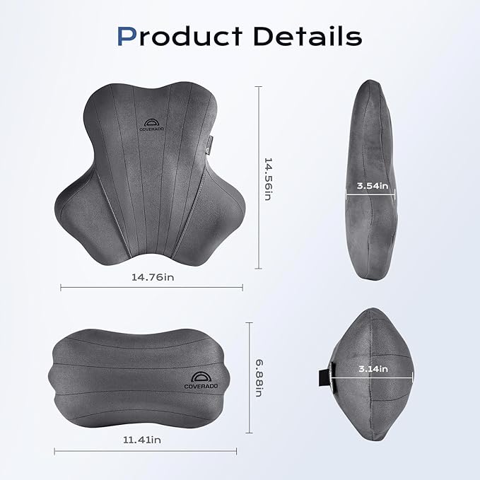 Coverado Car Lumbar Support Pillow and Car Neck Pillow Kit, Ergonomic Design Car Headrest Pillow for Driving, Relax Back Head Muscles Relieve Driving Fatigue, Breathable & Removable Cover, Gray