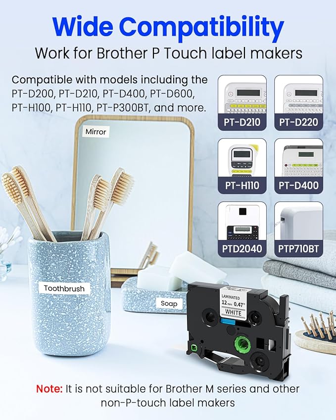 - This replace for brother label maker tape 12mm 0.47 white prints crisp, high-contrast text, giving storage boxes, files, and cords a clean, uniform look. compatible with ptouch tape 12mm 0.47 white helps improve the aesthetics of your workplace while also improving functionality.