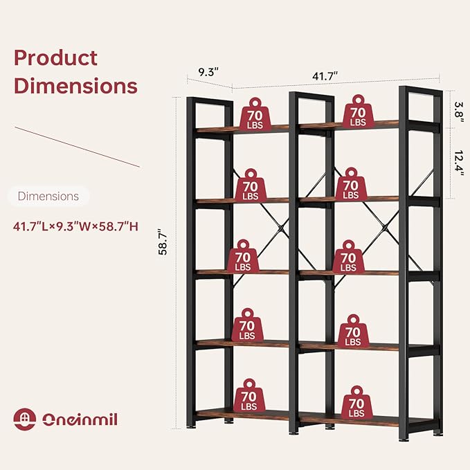 oneinmil 5 Tier Bookshelf Set of 2, 58.7'' Industrial Book Shelf, Wooden Bookshelves with 10 Open Display Shelves, Vintage Storage Rack, Standing Wide Bookcase for Home and Office, Rustic Brown