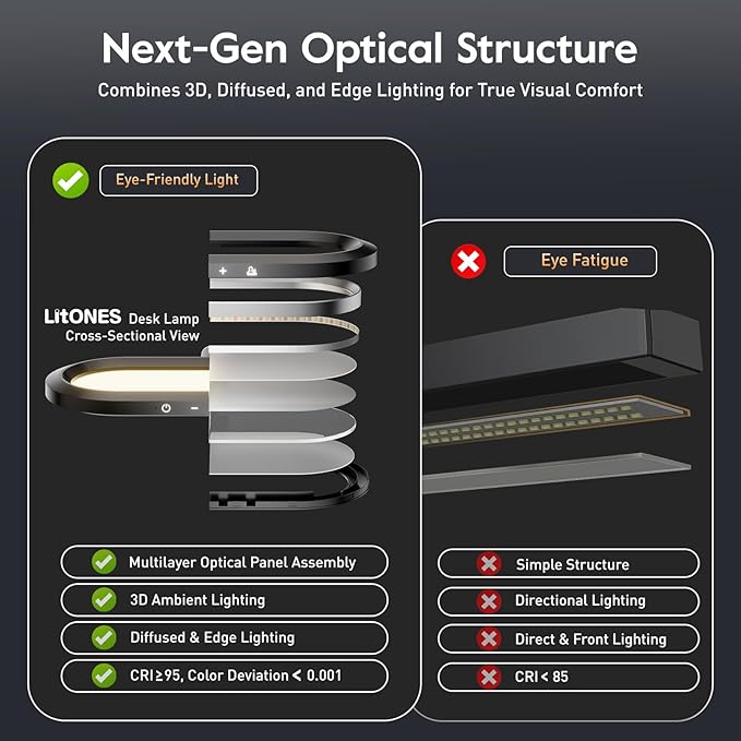 - Soft, Eye-Friendly 3D Ambient Lighting – All-Day Comfort, Less Eye Strain: LitONES desk lamp features a unique combination of 3D ambient light, diffused light, and side-emitting design to provide soft, even, three-dimensional lighting. This reduces harsh brightness contrasts in your workspace, minimizing frequent pupil adjustments that can lead to eye strain and fatigue. It creates a more comfortable lighting environment, ideal for long hours of computer work, video conferencing, and home office use.