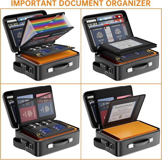 - Fireproof Box with Lock: Protect your valuables with the built-in high-quality combination lock (No keys required). Design with a strong handle&a detachable shoulder strap for carrying everything you needed easily. The fireproof box is suitable for business, travel, office, school, home storage, of course, giving it as a gift to your family is also a good choice. Fireproof box is both fireproof and water-resistant, ensuring your documents stay protected during fires, floods, or wet weather