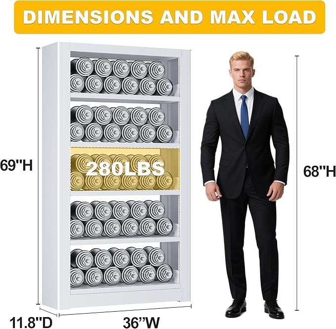 - Heavy-Duty Metal Bookshelf:This industrial-grade steel bookshelf measures 69"H x 36"W x 11.8"D with incredible 280lbs per shelf capacity. The reinforced metal frame and thickened base provide superior stability compared to flimsy wooden bookcases. Adjustable shelves accommodate oversized art books, storage bins and heavy collectibles with no sagging.