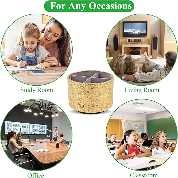 lizimandu Round Leather Art Supply Organizer,Remote Control Holder,360 Degree Spinning,Multi-Functional Pencil Holder,4 Compartments Desktop Stationary Organizer(1-Carved Gold)