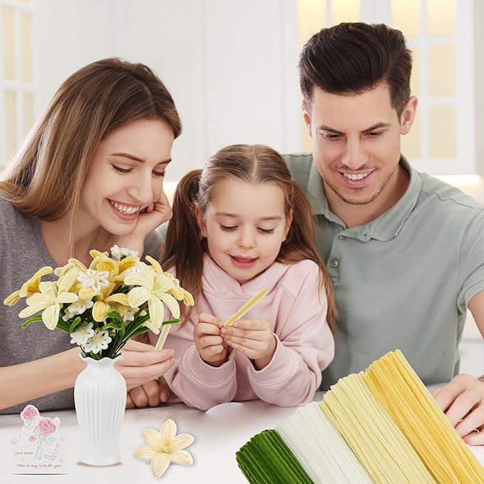 - 【Pipe cleaner crafts kit】The product includes all crafting accessories for flower bouquets: 400pcs pipe cleaner,20pcs floral Wires, 2pcs gardening tape,2pcs hot glue Sticks,1pc greeting card,3pcs bouquet paper, 1 bag stamen ,1pc Ribbon,&1pc instrution.
