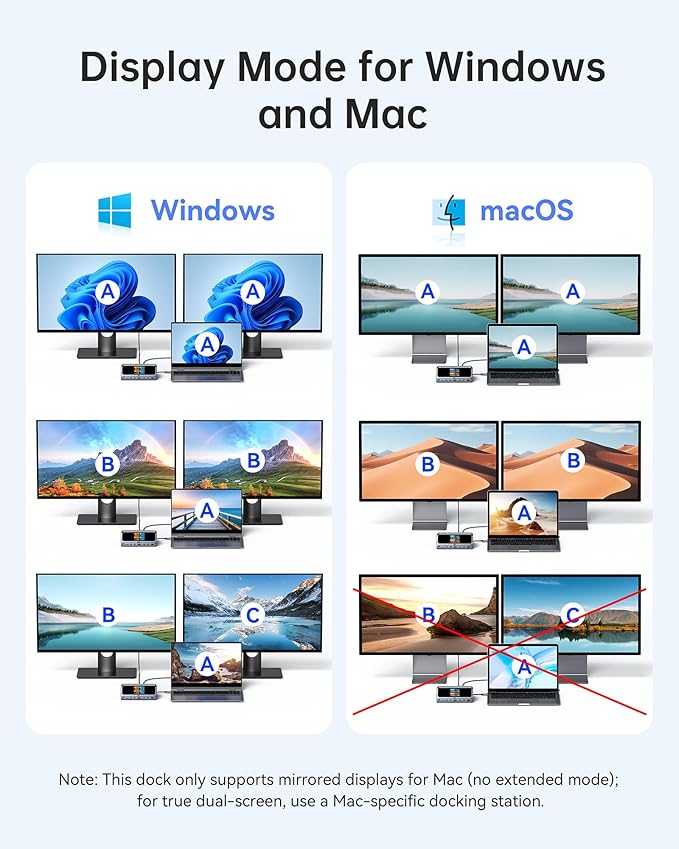 - Universal Docking Station for Windows:Supports USB-C, USB4, and Thunderbolt connections. Compatible with Windows 10 and 11, ChromeOS, and laptops that support DP Alt Mode and Power Delivery. Note: 1. For macOS, the displays on the both external monitors are identical. 2. This device is not compatible with Linux