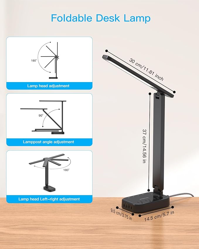 - 【 Multi-Angle Adjustable Table Lamp 】 - The led desk light head can 180° adjustable up and down, right and left, allowing you to fine-tune the light direction for greater lighting range and flexibility. With 90° foldable lamp arm, full foldable, small footprint, space saving.