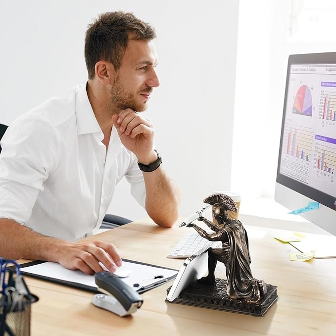 - Sturdy Resin Construction: crafted from resin, the knight pen holder ensures durability and longevity; Its structure reflects a cool office gadget that stands firm on your desk, proving both practical and resilient over time; The bronze finish adds a regal touch, preserving its hue brilliantly, showing that this pen holder for desk arrangements is a robust option that artfully withstands the test of time